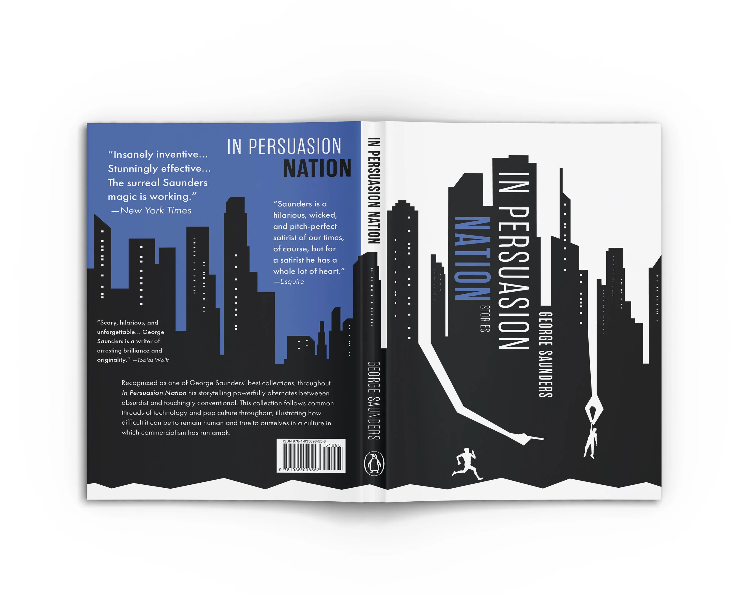 “In Persuasion Nation” is a collection of short stories set in a dystopian future where human impulses and motivations are shaped and formed by others. Most of the humans in the story are influenced by their surroundings I wanted to create a visual for that narrative. I created a cityscape silhouette with arms formed within the negative space within the buildings that are guiding the figures around the city.