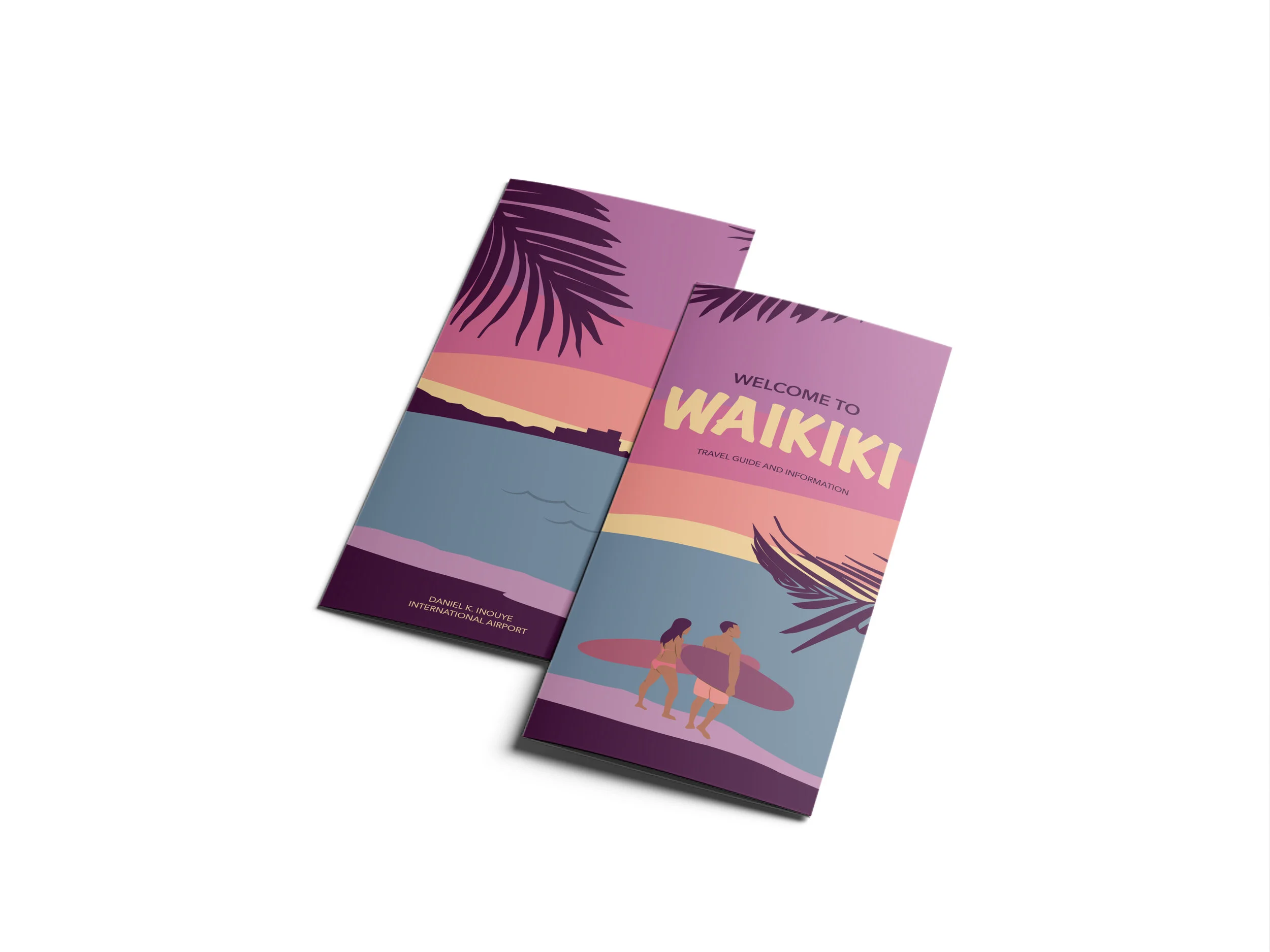 For this assignment, we were to select a location of interest for a tourist or visitor and create an illustrated visit guide of that location that best reflects what the location represents. Waikiki is best known for its beautiful beaches and scenery. For this design, I chose a colorful sunset inspired color palette and includes lots of beach imagery.